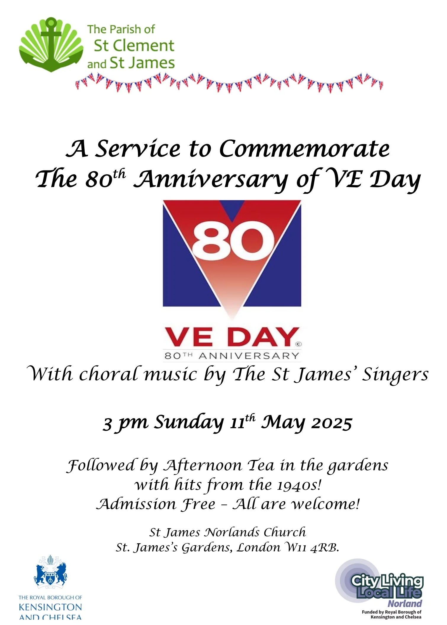 "At 3.30pm on the afternoon of Sunday 11th May, we will be holding a special service to commemorate the 80th anniversary of VE Day! This will be similar to the celebration services we held to mark the late Queen’s Platinum Jubilee and the King’s Coronation. The service will be led by our magnificent professional choir, the St James’ Singers and will be followed by afternoon tea in the gardens, when the St James’ singers will entertain us with war-time songs from the 1940s! This is a community event to which all are invited and there will be no charge either for the service or the refreshments afterwards."